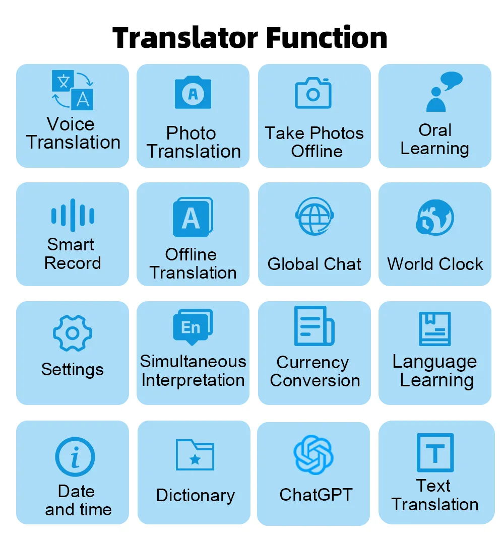 The Fastdealmall Language Translator Device combines a wide range of smart features in one device. It supports voice translation, photo translation, offline translation, simultaneous interpretation, text translation, and dictionary lookup. Additional tools include smart recording, global chat, currency conversion, ChatGPT AI assistance, oral practice, language learning, and a world clock, making it a complete solution for communication, travel, and education.