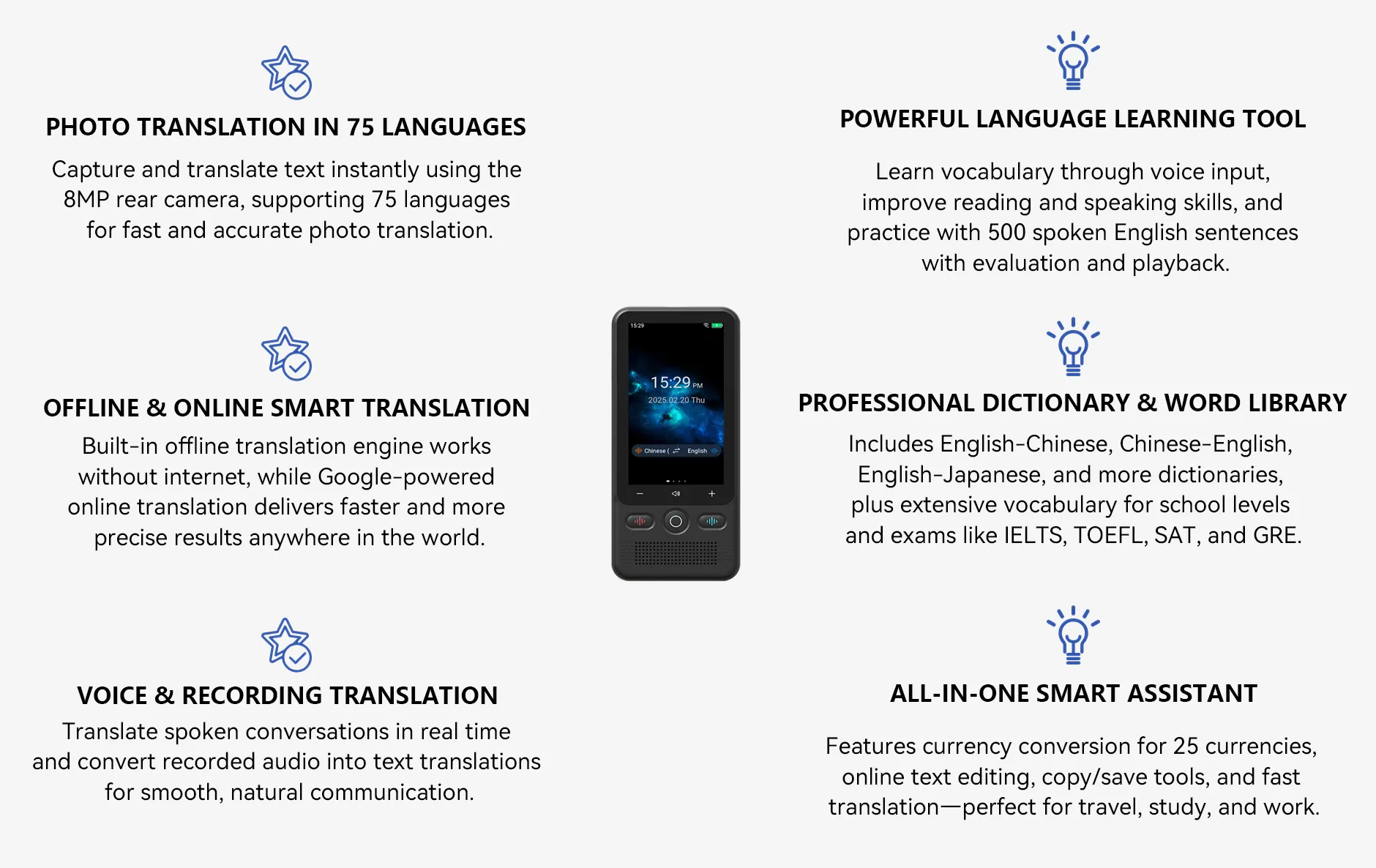 The Fastdealmall Language Translator Device features a built-in offline translation engine for fast and accurate use without internet, ideal for emergencies and travel. It also supports voice translation in 160 languages online and 17 languages offline, including recording and translating audio for smooth global communication.