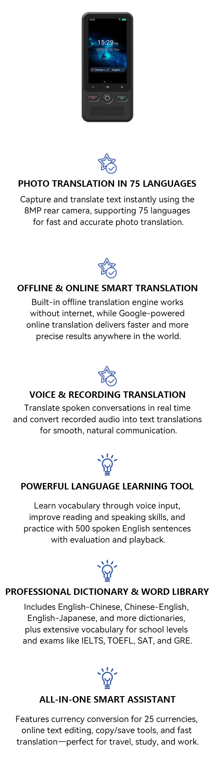 - Offline Translation – Works without internet for fast, accurate translation anytime.