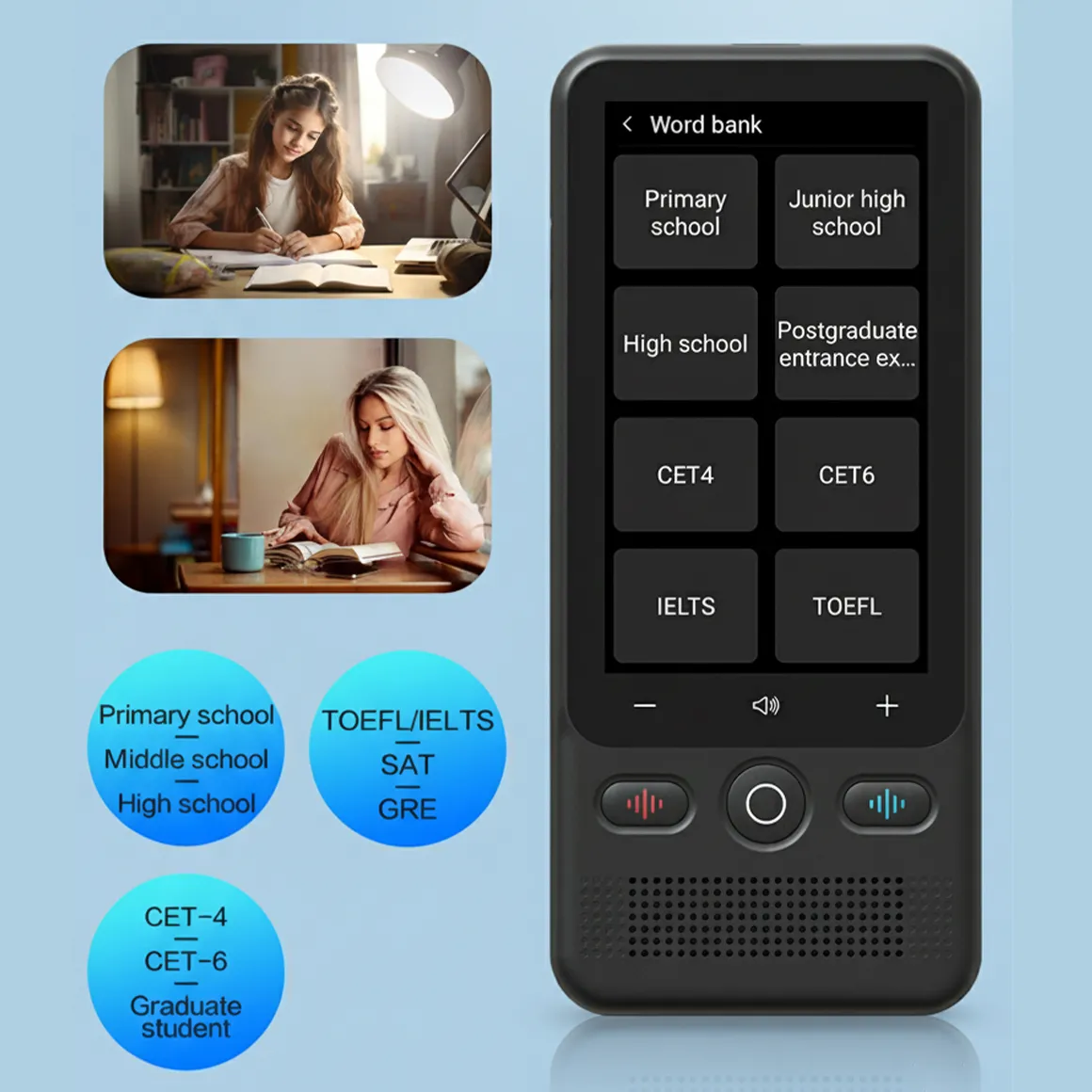 The Fastdealmall Language Translator Device comes with an extensive word library covering elementary, middle, and high school levels, as well as CET-4, CET-6, postgraduate exams, IELTS, TOEFL, SAT, and GRE. With ten curated lists, it makes learning English vocabulary from beginner to advanced levels easy and efficient.